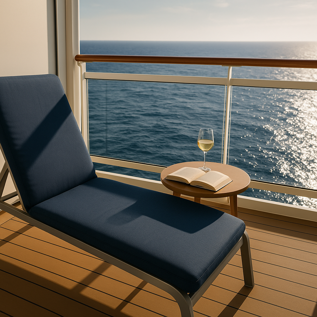 Hình dung bạn đang ngồi trên boong tàu, nắng nhẹ xuyên qua lan can kính, tiếng sóng vỗ nhẹ dưới chân tàu, một cuốn sách mở ra giữa gió biển lồng lộng, bên cạnh là ly vang sóng sánh màu hổ phách. Không ai gọi tên bạn, không thông báo gấp gáp – chỉ có bạn và sự tĩnh lặng thanh cao.